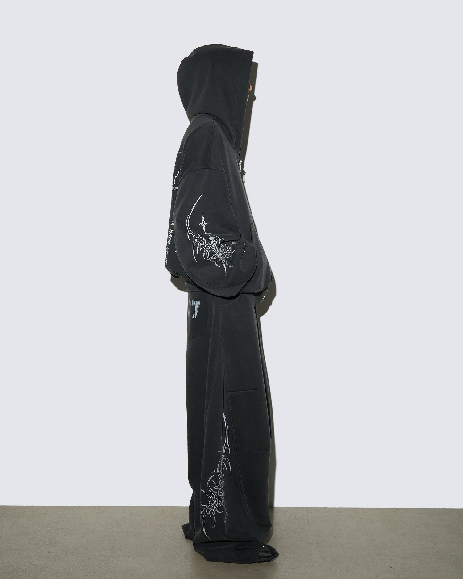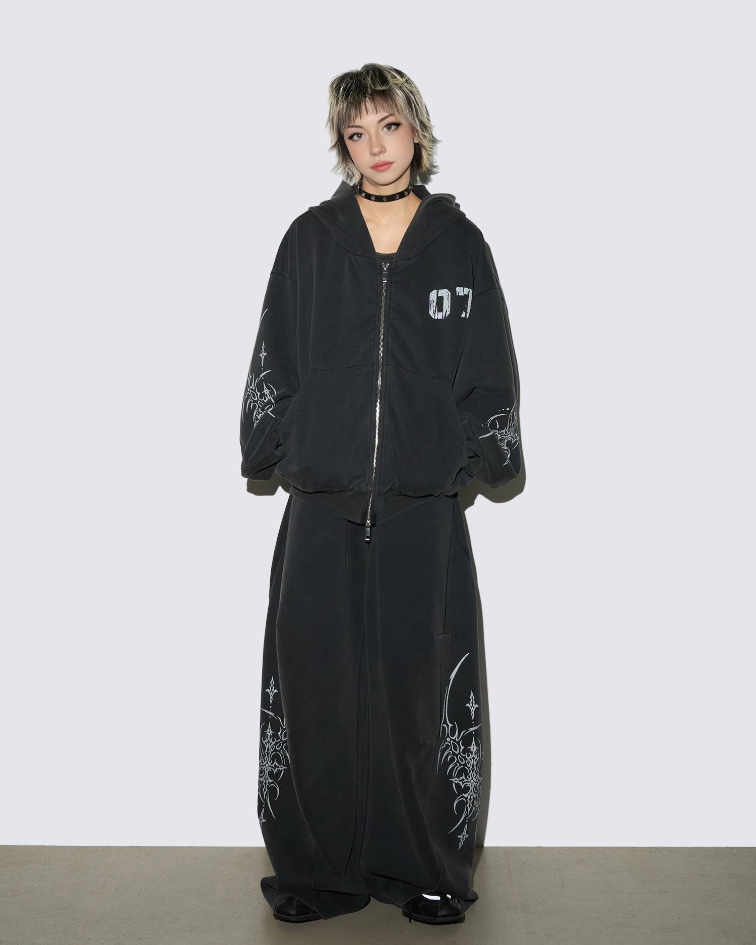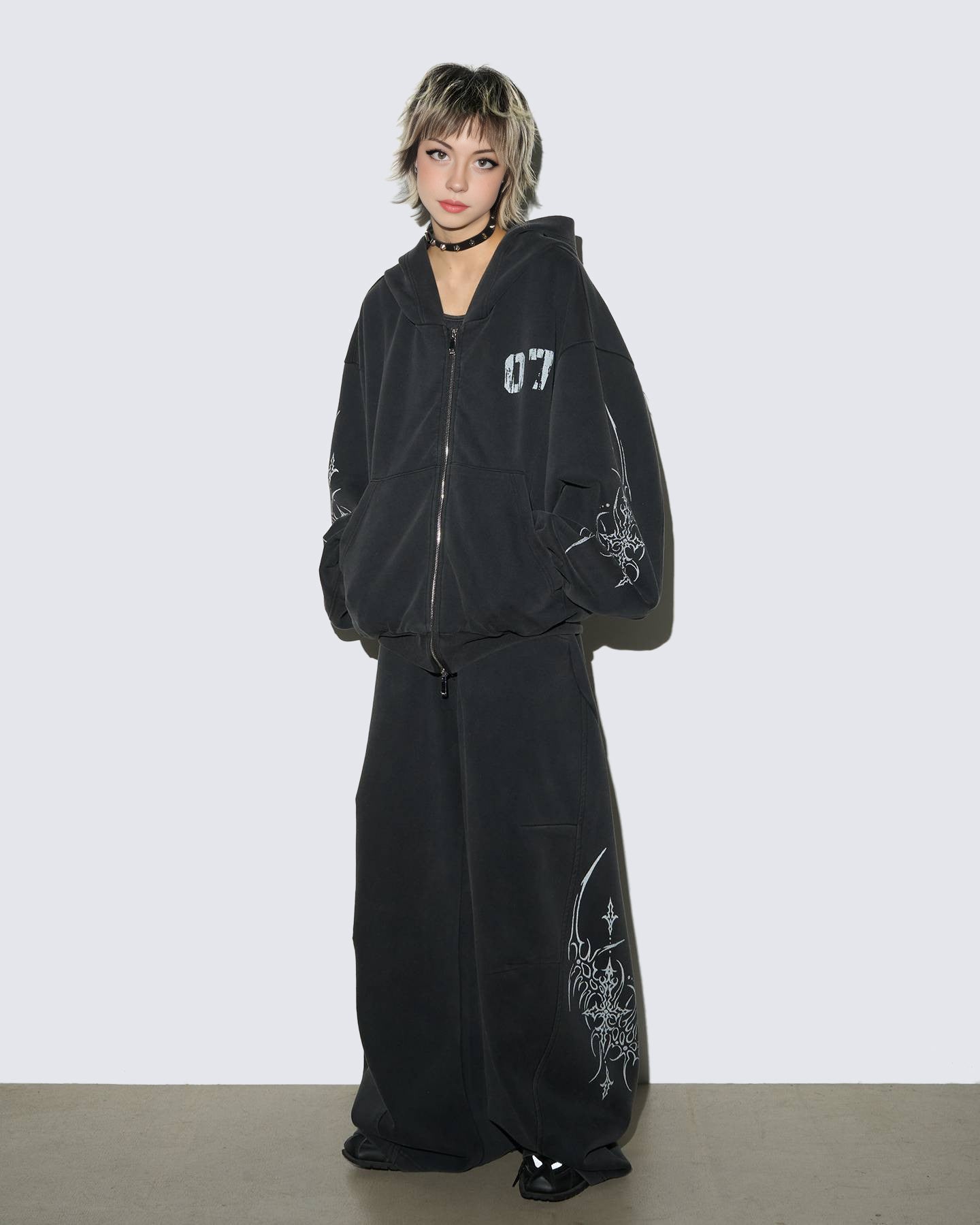 The "Dark Hand-Drawn" set blends streetwear attitude with dark art energy — a bold statement for those who dress with purpose. The hoodie’s cropped cut and the wide-leg pants create an effortlessly oversized silhouette that’s both comfortable and commanding.
