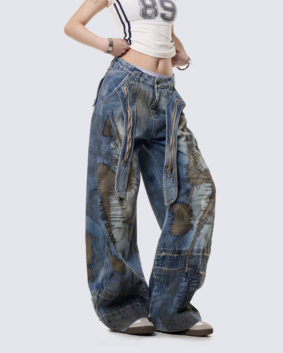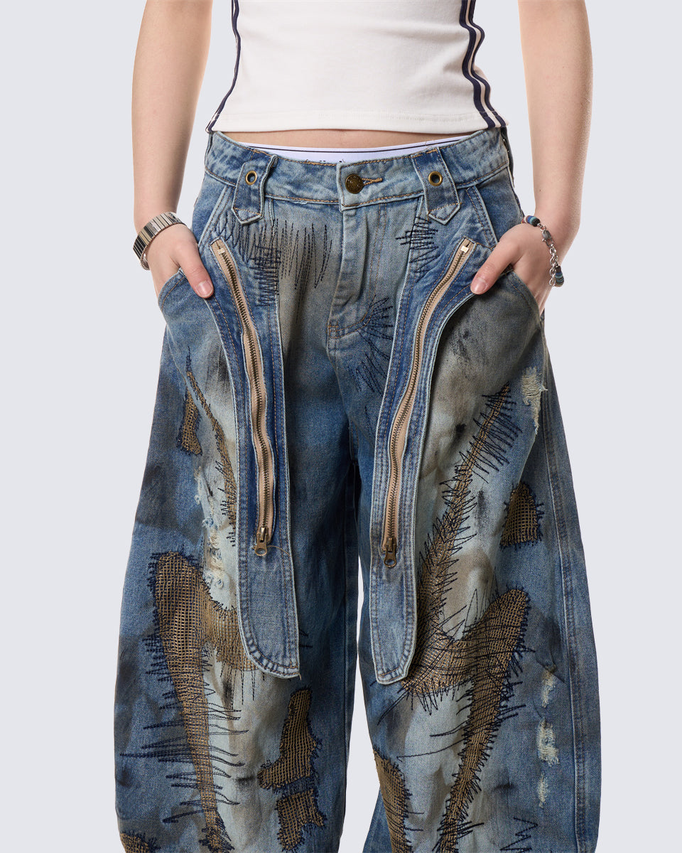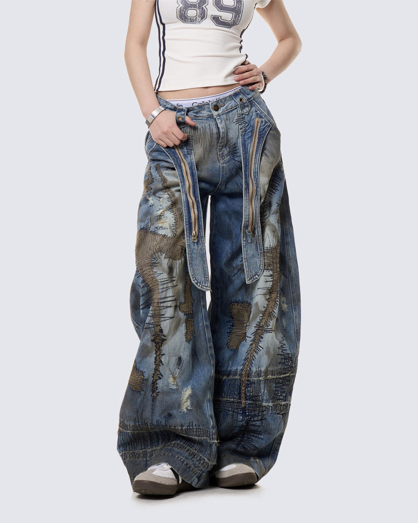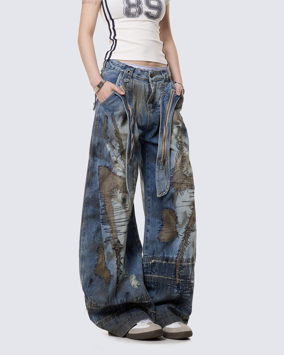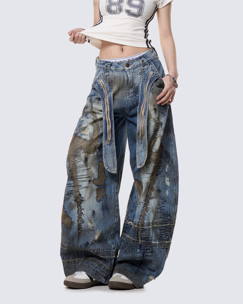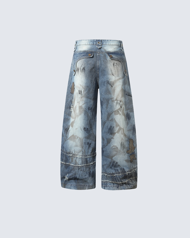 Unapologetically bold—these wide-leg denim pants feature grunge-style stain dye, raw-edge distressing, and chaotic embroidery for that true baddie energy.